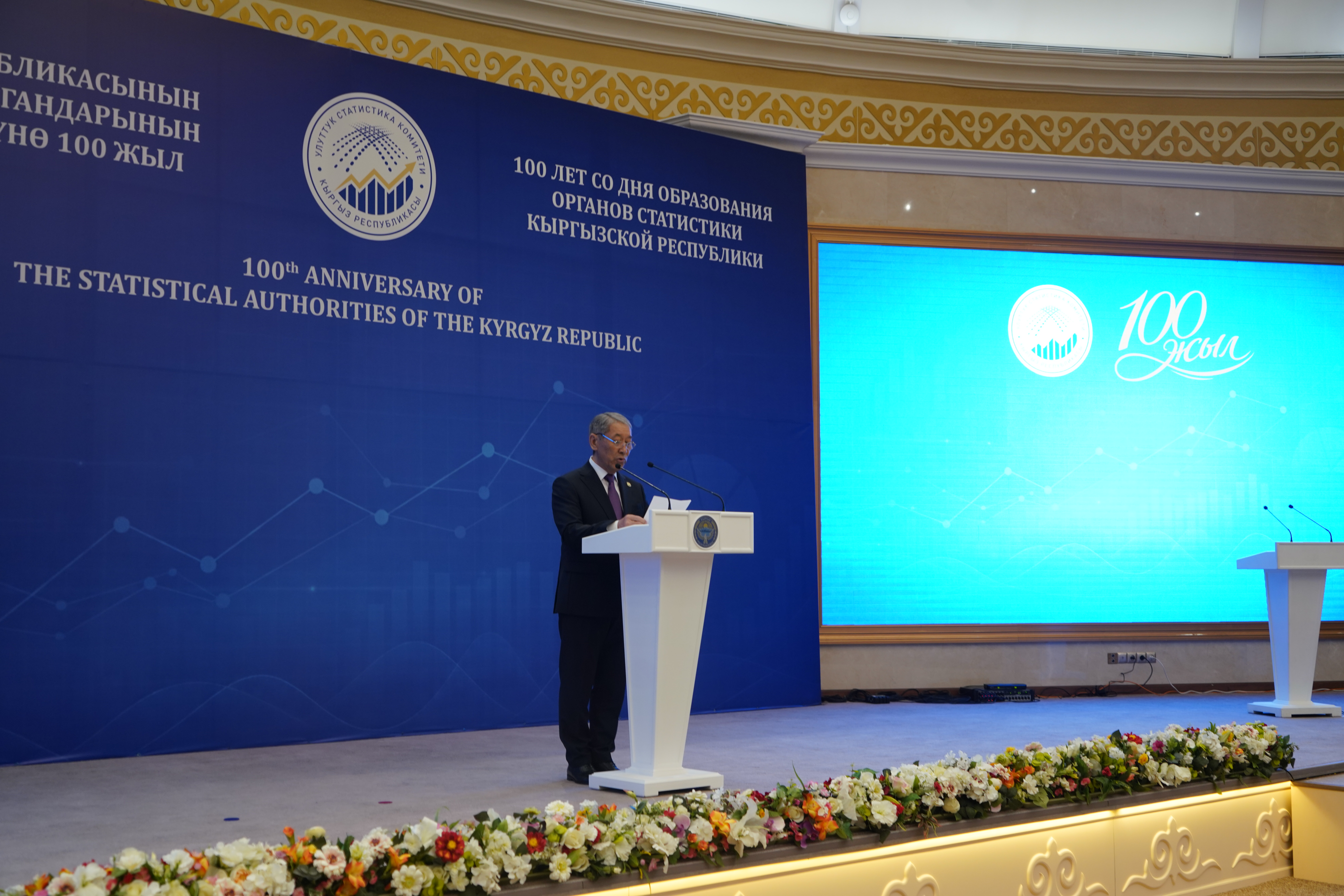 Куттуктоо сөзү менен Кыргыз Республикасынын Улуттук статистика комитетинин төрагасы Бактыбек Кудайбергенов сөз сүйлөдү. Ал тармактын жүз жылдык тарыхы - бул тактыкты, объективдүүлүктү жана кесиптик жоопкерчиликти күнүмдүк ишинин негизине айланткан көптөгөн муундардын эмгегинин жыйынтыгы экенин белгиледи.