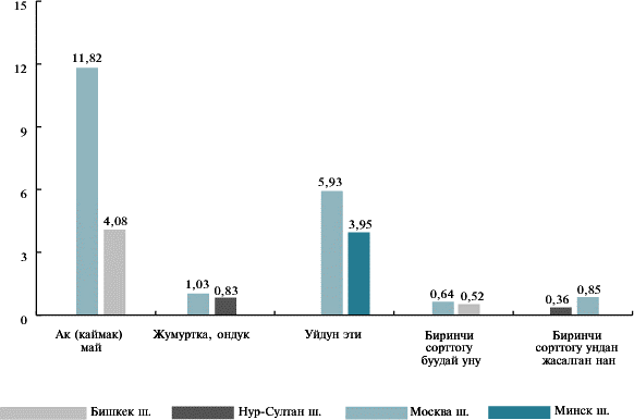 2020-жылдын июлунда орточо керектөө бааларынын деңгээли Бишкек шаарында пастеризацияланган сүткө Минск шаарында – 10,0 пайызга, уй этине – 14,7 пайызга, ал эми биринчи сорттогу ундан жасалган нанга Нур-Султан шаарында - 37,9 пайызга, Минск шаарында - 8,6 пайызга байкалган баалардан жогору болуп түзүлдү. Муну менен бирге, 2020-жылдын июлунда жумурткага болгон орточо баалар Бишкек шаарында Нур-Султан шаарындагы баалардын деңгээлинен 14,4 пайызга ашты.