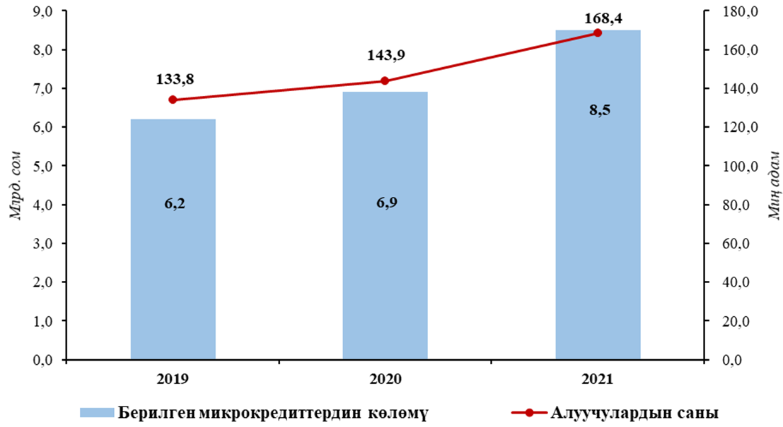 Үстүбүздөгү жылдын I кварталында микрокредиттерди берүүчү уюмдар тарабынан 8,5 млрд. сом суммасында кредиттер берилди, муну менен бирге алуучулардын саны 168,4 миң адамды түздү. Микрокредит алган калктын саны өткөн жылдын тийиштүү мезгилине салыштырганда 17%га, ал эми берилген микрокредиттердин көлөмү - 23,4%га көбөйдү.
