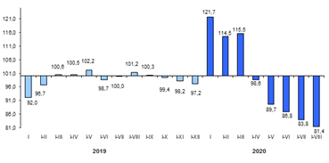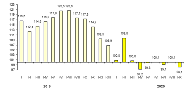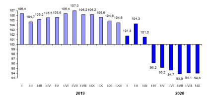 Ички дүң продукт 2020-жылдын январь-сентябрь айларында, алдын ала баалоо боюнча, 400 миллиард сомдон ашты жана 2019-жылдын январь-сентябрь айларына салыштырмалуу 6 пайызга төмөндөдү.