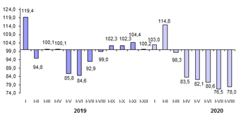 Курулуш тармагында төмөндөөлөр байкалат, анын көлөмү - 7,7 пайызга азайды, дүң жана чекене соода тармагы - 14,9 пайызга төмөндөсө, дүң жана чекене соодас тармагында 16,2 пайызга азайды, ал эми айыл чарбасында оң тенденциялар байкалды, анда өндүрүүнүн көлөмү 2,1 пайызга өстү.