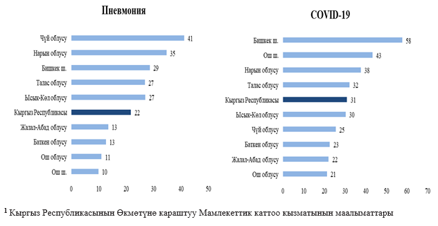 Пневмониядан болгон өлүмгө учуроолордун орточо республикалык көрсөткүчтөн кыйла жогору болушу Чүй жана Нарын облустарында, ошондой эле Бишкек шаарында, ал эми коронавирустук инфекциядан (COVID-19) болгон өлүмдөр Бишкек жана Ош шаарларында, ошондой эле Нарын облусунда белгиленди.