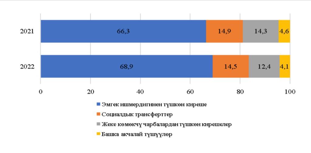 2022-жылы калктын киши башына алгандагы реалдуу орточо акчалай кирешелери айына 7 396,7 сомду түзүп, өткөн жылга салыштырганда 5,5 пайызга көбөйдү.