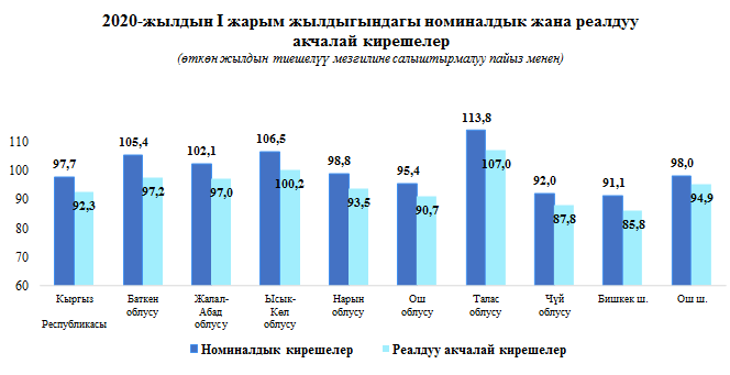 2020-жылдын I жарым жылдыгында калктын реалдуу акчалай кирешелеринин көлөмү өлкө боюнча 198,9 млрд. сомду түздү жана өткөн жылдын тийиштүү мезгилине салыштырмалуу 7,7 пайызга төмөндөдү.