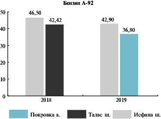 Ошентип, орточо республикалык баалар 2019-жылдын июлунда 2018-жылдын июлуна салыштырмалуу А-92 бензинине карата баа 4 сомго, же 9,1 пайызга төмөндөдү. Ал эми дизелдик күйүүчү майга, тескерисинче, бир азга (30 тыйынга, же 0,7 пайызга) кымбаттады.
