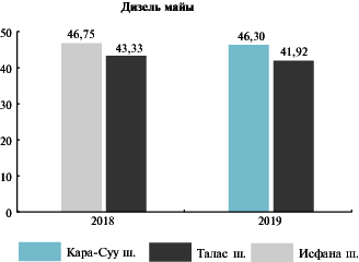 Дизелдик күйүүчү майга карата айтсак, эң жогорку орточо керектөө баалары Кара-Суу шаарында (бир литри - 46,30 сом), Баткен шаарында (бир литри - 46,30 сом) жана Ош шаарында (бир литри – 46,20 сом) катталган. Муну менен катар, дизелдик күйүүчү майга карата минималдуу баалар Покровка айылында (бир литри - 42,70 сом), Талас шаарында (бир литри – 42,06 сом литр) жана Токмок шаарында (бир литри – 42,09 сом) белгиленди.