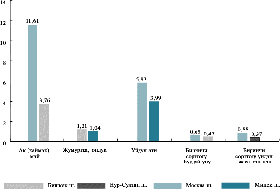 2021-жылдын январында орточо чекене бааларынын деңгээли Бишкек шаарында пастеризацияланган сүткө Нур-Султан шаарында – 1,5 пайызга жана Минск шаарында – 9,0 пайызга, уй этине Минск шаарында –25,3 пайызга, ал эми биринчи сорттогу ундан жасалган нанга Нур-Султан шаарында – дээрлик үчтөн бирге жана Минск шаарында – 7,3 пайызга байкалган баалардан жогору болуп түзүлдү. Муну менен бирге, 2021-жылдын январында Бишкек шаарында жумурткага болгон орточо керектөө баалар Минск шаарындагы баалардын деңгээлинен 14,0 пайызга, Нур-Султан – 12,4 пайызга жана Москва – 9,9 пайызга өстү.