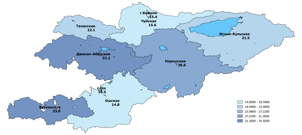 Кыргыз Республикасынын Улуттук статистика комитетинин маалыматтары боюнча 2018-жылы кыргызстандыктардын 22,4 пайызы же калктын 1 млн. 429 миң адамы кедейчиликте, анын ичинен 35 миңи өтө кедейчилик чегинде жашаган.