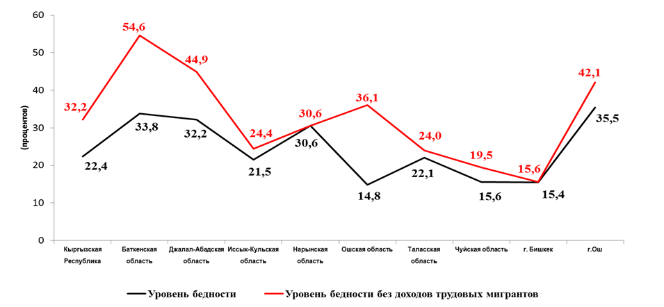 Керектөө наркынан эмгек мигранттарынын кирешелерин чыгарып салсак, кедейчликтин деңгээли республика боюнча орточо 22,4 пайыздан 32,2 пайызга чейин өсө тургандыгын эксперименталдык эсептөөлөр көрсөтүп турат.