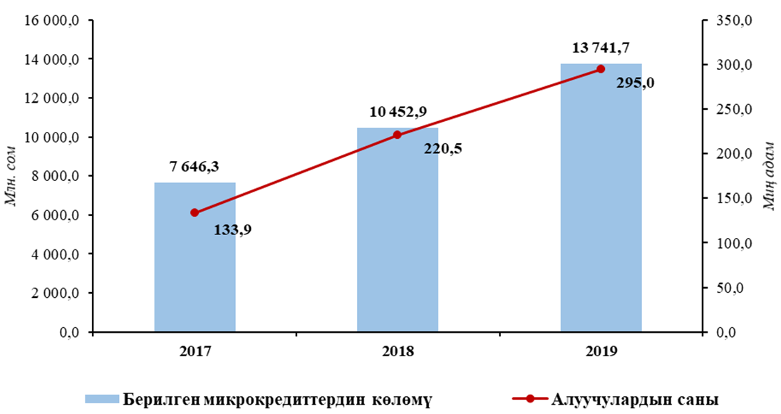 Үстүбүздөгү жылдын январь-июнунда микрокредиттерди берүүчү уюмдар тарабынан 13 741,7 млн. сом суммасында кредит берилип, алуучулардын саны 295 миң адамды түздү. Микрокредит алган калктын саны өткөн жылдын тийиштүү мезгилине салыштырганда 33,8 пайызга, ал эми берилген микрокредиттердин көлөмү – 31,5 пайызга көбөйдү.