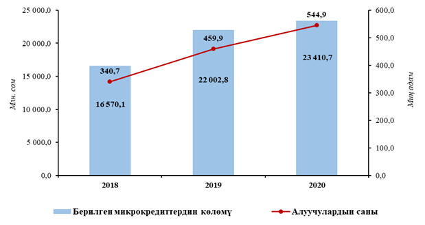 Үстүбүздөгү жылдын январь-сентябрында микрокредиттерди берүүчү уюмдар тарабынан 23,4 млрд. сом суммасында кредиттер берилди, муну менен бирге, алуучулардын саны деээрлик 545 миң адамды түздү. Микрокредит алган калктын саны өткөн жылдын тийиштүү мезгилине салыштырганда 18,5 пайызга, ал эми берилген микрокредиттердин көлөмү – 6,4 пайызга көбөйдү.