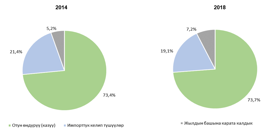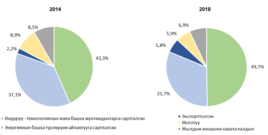 2018-жылы республиканын ички рыногунда 14,5 млн. тонна отун ресурстарынын шарттуу отуну сарпталды, анын ичинен 8,9 млн. тонна шарттуу отун же 61 пайызы өндүрүү-технологиялык жана башка муктаждыктарга, 5,6 млн. тонна шарттуу отуну же 39 пайызы - энергиянын башка түрлөрүн айлантууга сарпталган.