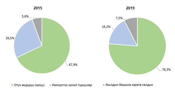 Жаратылыш ресурстарын өндүрүүнүн жалпы суммасынын ичинде көмүрдүн үлүшүнүн көбөйгөндүгү белгиленди. Эгерде, 2015-жылы ал 9,7 % түзсө, ал эми 2019-жылы 10,5 % жетти. Ошондой эле 2019-жылы көмүр өндүрүүнүн көлөмү 2,6 млн. тоннаны түзүп, 2015-жылга салыштырмалуу 35 % пайызга жогорулады. Негизинен алганда көмүр ички рынокто керектелет, анын керектөө үлүшү жалпы керектөөлөрдүн ичинен 44 % жакынын түздү. Мунай заттарына болгон суроо-талап негизинен импорттук келип түшүүлөрдүн эсебинен толтурулат.