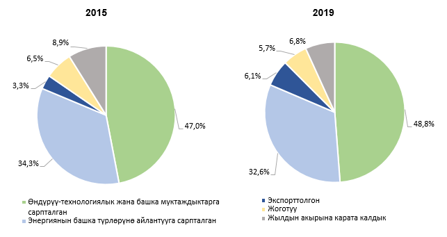 2019-жылы республиканын ички рыногунда 13,4 млн. тонна отун ресурстарынын шарттуу отуну сарпталды, анын ичинен 8,0 млн. тонна шарттуу отун же 60 % өндүрүү-технологиялык жана башка муктаждыктарга, 5,4 млн. тонна шарттуу отуну же 40 % - энергиянын башка түрлөрүнө айлантууга сарпталган.