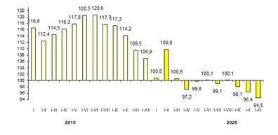 2020-жылдын январь-ноябрь айларында ички дүң продукт алдын ала баалоо боюнча 511 миллиард сомду түзүп, 2019-жылдын январь-ноябрь айларына салыштырмалуу 8,1 пайызга төмөндөдү.