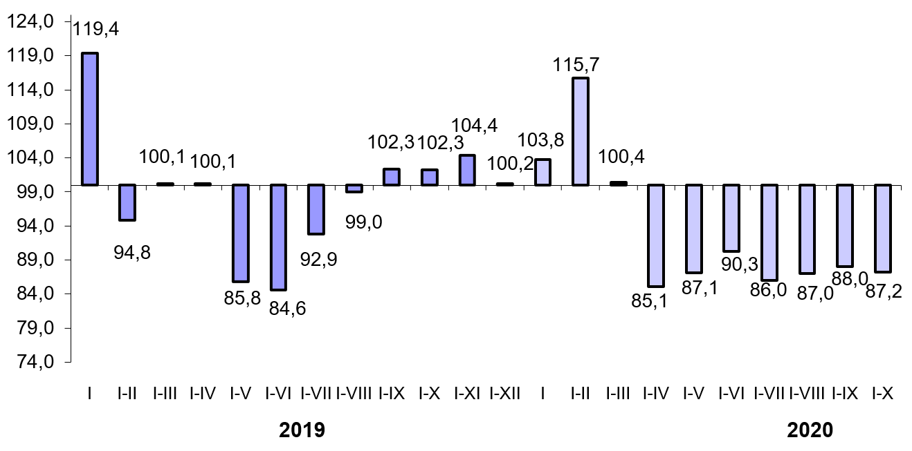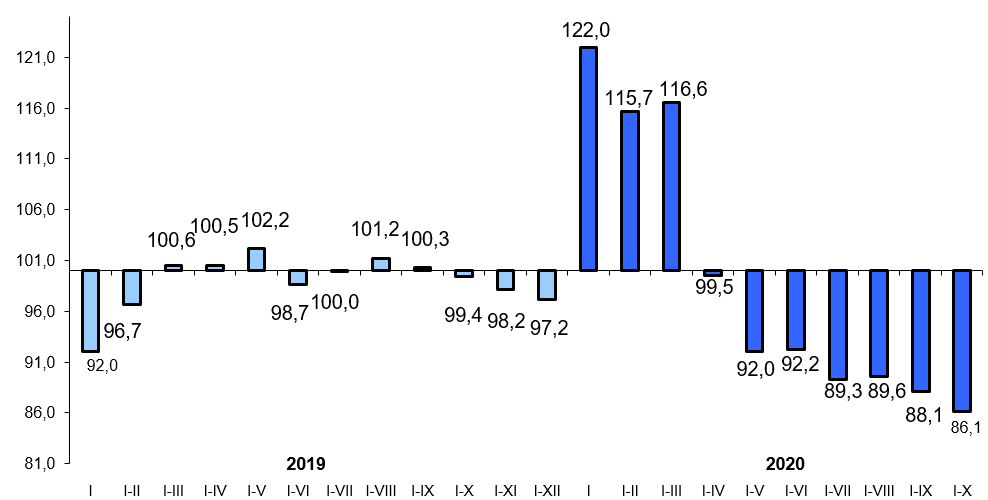 2020-жылдын январь-октябрында Республиканын ЕАЭБнын мүчө-мамлекеттери менен өз ара соодасынын көлөмү 2 млрд АКШ долларын түздү жана 2019-жылдын январь-октябрына салыштырмалуу 13,7 пайызга азайган.