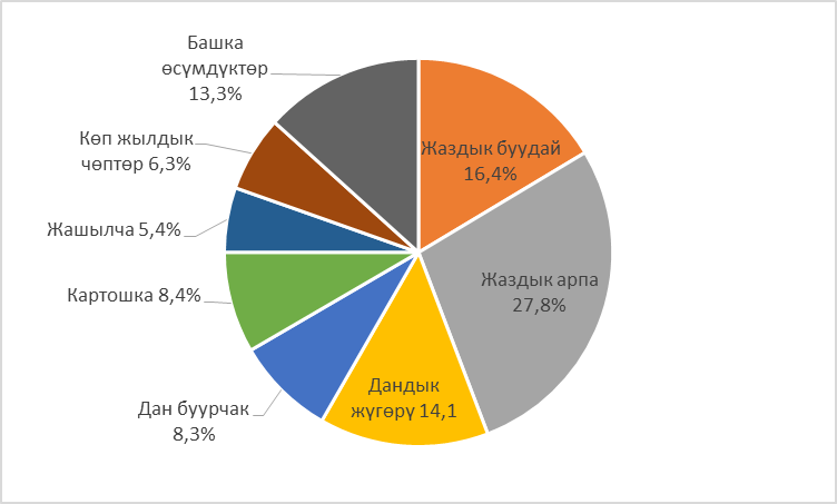 Себилген жаздык өсүмдүктөрдүн айдоо аянттарынын жалпы түзүмүндө жаздык арпанын үлүшүнө – 27,8 пайызы, жаздык буудайга – 16,4 пайызы, дандык жүгөрүгө – 14,1 пайызы, дан буурчак – 8,3 пайызы, тоют өсүмдүктөрүнө – 6,3 пайызы, жашылчаларга – 5,4 пайызы, картошкага – 8,4 пайызы жана башка өсүмдүктөргө (кант кызылчасы, пахта,тамеки, май өсүмдүктөрү, бакча өсүмдүктөрү жана башка дан эгиндери) 13,3 пайызы туура келет.