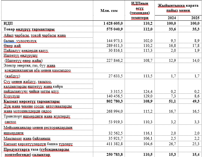 ИДПнын түзүмүндөгү эң чоң үлүш (49,3%) кызмат көрсөтүү тармактарына туура келди, бул өткөн жылдын январь-ноябрь айларына салыштырмалуу 1,8 пайыздык пунктка тѳмѳндѳгѳн. Ошол эле учурда товар өндүрүү тармактарынын үлүшү, тескерисинче, 1,7 пайыздык пунктка жогорулап, 35,3%ды түздү. Мында курулуштун үлүшү өткөн жылдын ушул мезгилине салыштырмалуу 1,3 пайыздык пунктка өскөн болсо, өнөр жайдын үлүшү - 1,0 пайыздык пунктка өскөн, ал эми айыл чарбасынын үлүшү, тескерисинче, 0,6 пайыздык пунктка төмөндөгѳн.