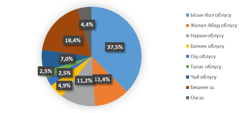Туризмдин жамааттык атайын жайгаштыруу турак жайларынын жана ишканаларынын негизги бөлүгү Ысык-Көл облусунда - 37,5 пайызы, Бишкекте – 18,4 пайызы, Жалал-Абад облусунда – 11,4 пайызы, Нарын облусунда – 11,2 пайызы жайгашкан.