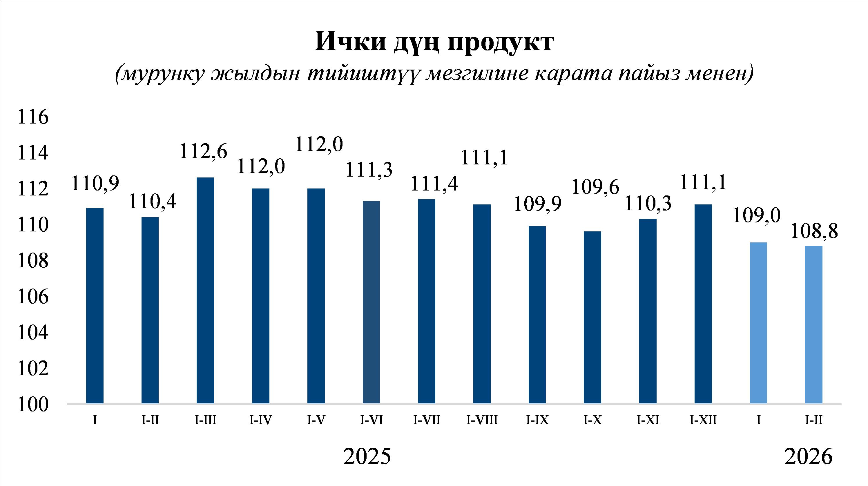 Алдын ала баалоо боюнча, 2026-жылдын январь-февраль айларында ички дүң продукция (ИДП) 264 миллиард сомду түзүп, 2025-жылдын январь-февралына салыштырмалуу 8,8 пайызга жогорулады.