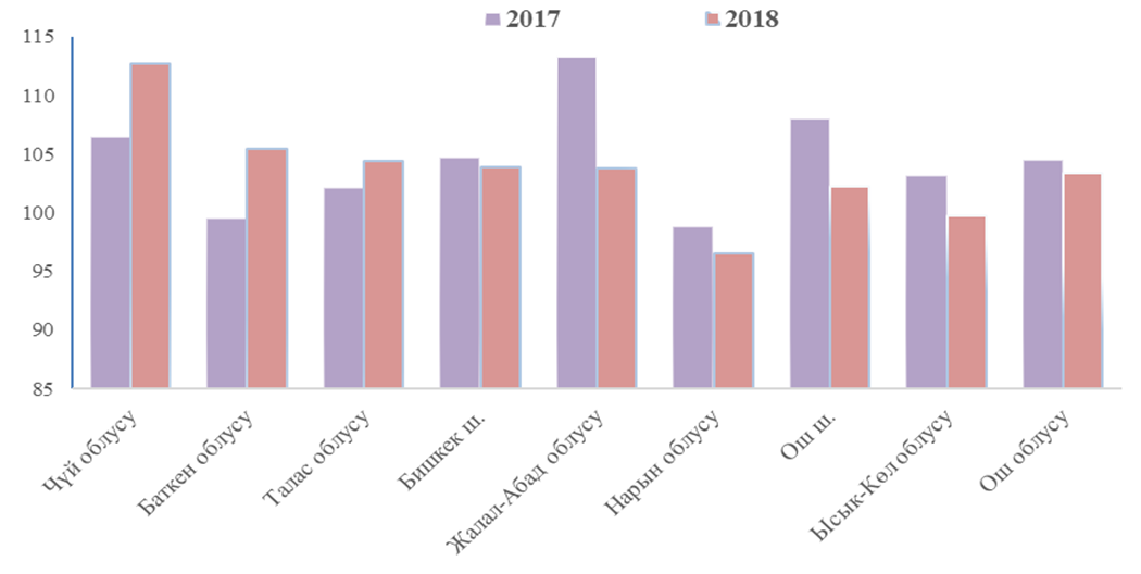 2018-жылы регионалдык дүң продуктунун эң жогорку өсүүсү Чүй облусунда (12,7 пайыз), Баткен облусунда (5,5 пайыз) жана Талас облусунда (4,4 пайыз) жетишилди, ал эми анын төмөндөгөнү Нарын облусунда (3,5 пайызга) байкалды.