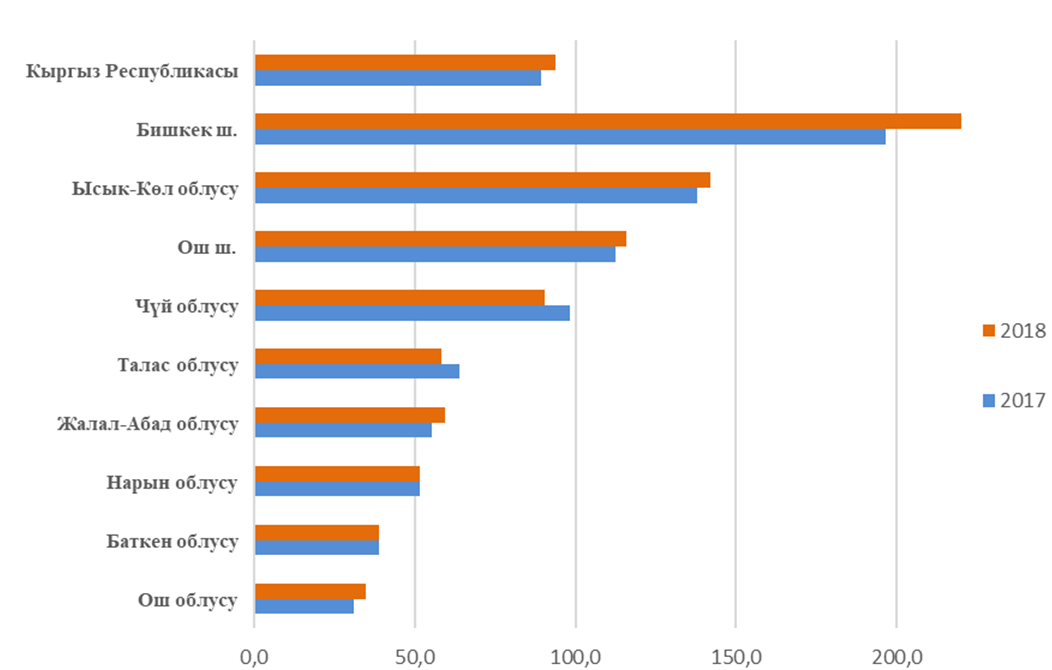 2018-жылы жалпы республика боюнча ички дүң продуктунун көлөмү киши башына 94 миңге жакын сомду түздү жана өткөн жылга салыштырмалуу 5,1 пайызга көбөйдү. Бул көрсөткүч Бишкек ш. (2,3 эсеге же 220,2 миң сом), Ысык-Көл облусунда (1,5 эсеге же 142,1 миң сом), Ош ш. (1,2 эсеге же 115,9 миң сом) республикалык деңгээлден жогору түзүлдү, ал эми Чүй облусунда ал 3,6 пайызга төмөн болду же 90,4 миң сомду түздү.