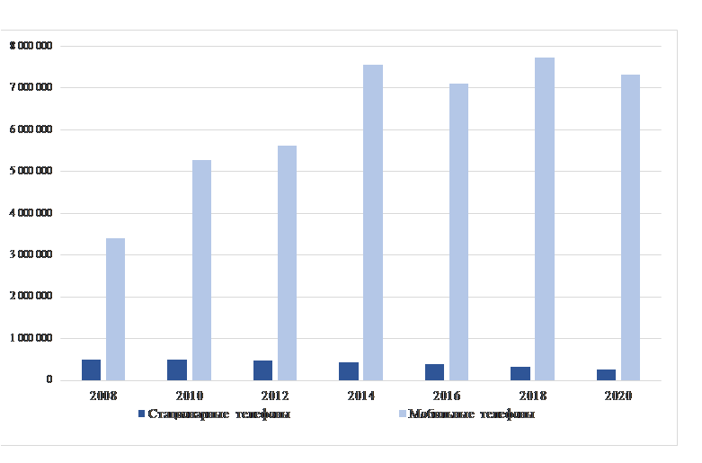 Так, если в 2008 году на 1000 населения приходилось 94 стационарных телефона и 635 мобильных телефонов связи, то в 2020 году число стационарных телефонов снизилось до 41 на 1000 населения, а число мобильных номеров достигло 1 102 и увеличилось за этот период почти в 1,7 раза.