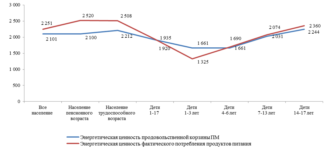 Химический состав и энергетическая ценность фактического питания населения отличается от установленных нормативов минимального набора продуктов питания. По социально-демографическим группам населения, энергетическая ценность потребленных продуктов населения пенсионного и трудоспособного возраста выше продовольственной корзины прожиточного минимума. Но у детей от 1 до 3 лет наблюдается низкая калорийность питания.