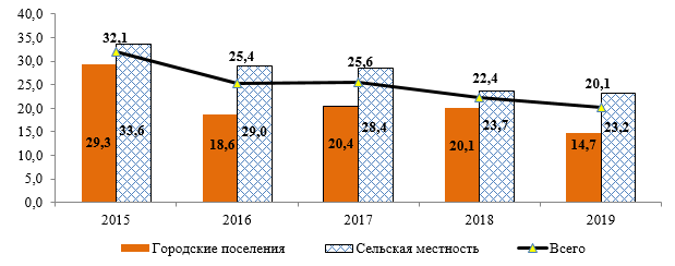 Уровень бедности в 2019 году, рассчитанный по потребительским расходам, в целом по стране составил 20,1 процента, что меньше по отношению к предыдущему году на 2,3 процентных пункта.