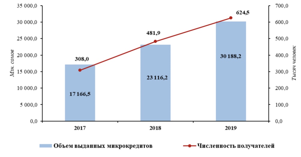 В 2019 году микрокредитными организациями выдано кредитов на сумму 30 188,2 млн. сомов, при этом число получателей составило 624,5 тысяч человек. По сравнению с предыдущим годом численность населения, охваченного микрокредитованием, увеличилась на 29,6 процента (на 142,6тысяч человек), а объем выданных микрокредитов - на 7 072,0млн. сомов.