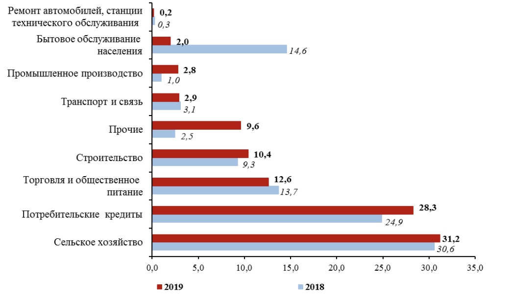 Из общего объема выданных в 2019 году микрокредитов 31,2 процента направлено на развитие деятельности в сельском хозяйстве, 28,3 процента заимствовано на потребительские нужды, 12,6 процента - в сферу торговли и общественного питания.