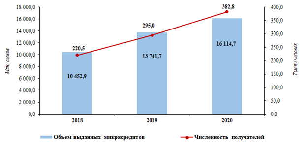 В I полугодии текущего года микрокредитными организациями выдано кредитов на сумму 16 114,7 млн. сомов, при этом число получателей составило 382,8 тысячи человек. По сравнению с соответствующим периодом прошлого года численность населения, охваченного микрокредитованием, увеличилась почти на 30 процентов, а объем выданных микрокредитов - на 17,3 процента.