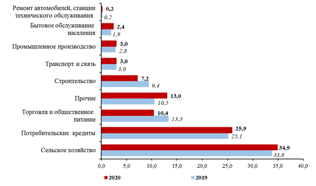 Из общего объема выданных в I полугодии текущего года микрокредитов 34,9 процента направлено на развитие деятельности в сельском хозяйстве, 25,8 процента заимствовано на потребительские нужды, 10,4 процента - в сферу торговли и общественного питания.