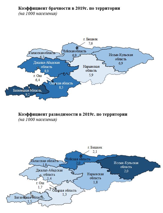 Чаще всего супруги оформляли разводы в г. Бишкек – 2,1 развода на 1000 населения, в Иссык-Кульской и Чуйской областях – по 2,0 развода на 1000 населения. Реже всего разводились жители Ошской (1,3 развода на 1000 населения) и Джалал-Абадской областей (1,4 развода на 1000 населения).