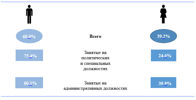 Тем не менее, как и в предыдущие годы, в 2019 году преобладание мужчин, занятых на государственной службе, продолжало сохраняться, как в сфере деятельности органов государственного управления (60,8%), так и в органах местного самоуправления (65,9%).