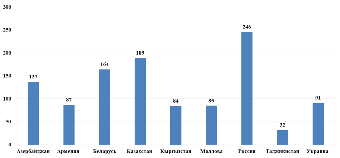 Как показывает график, наибольший размер трудовой пенсии среди стран СНГ отмечался в России (246 долларов) и Казахстане (189 долларов), а наименьший – в Таджикистане (32 доллара) и Кыргызстане (84 доллара).
