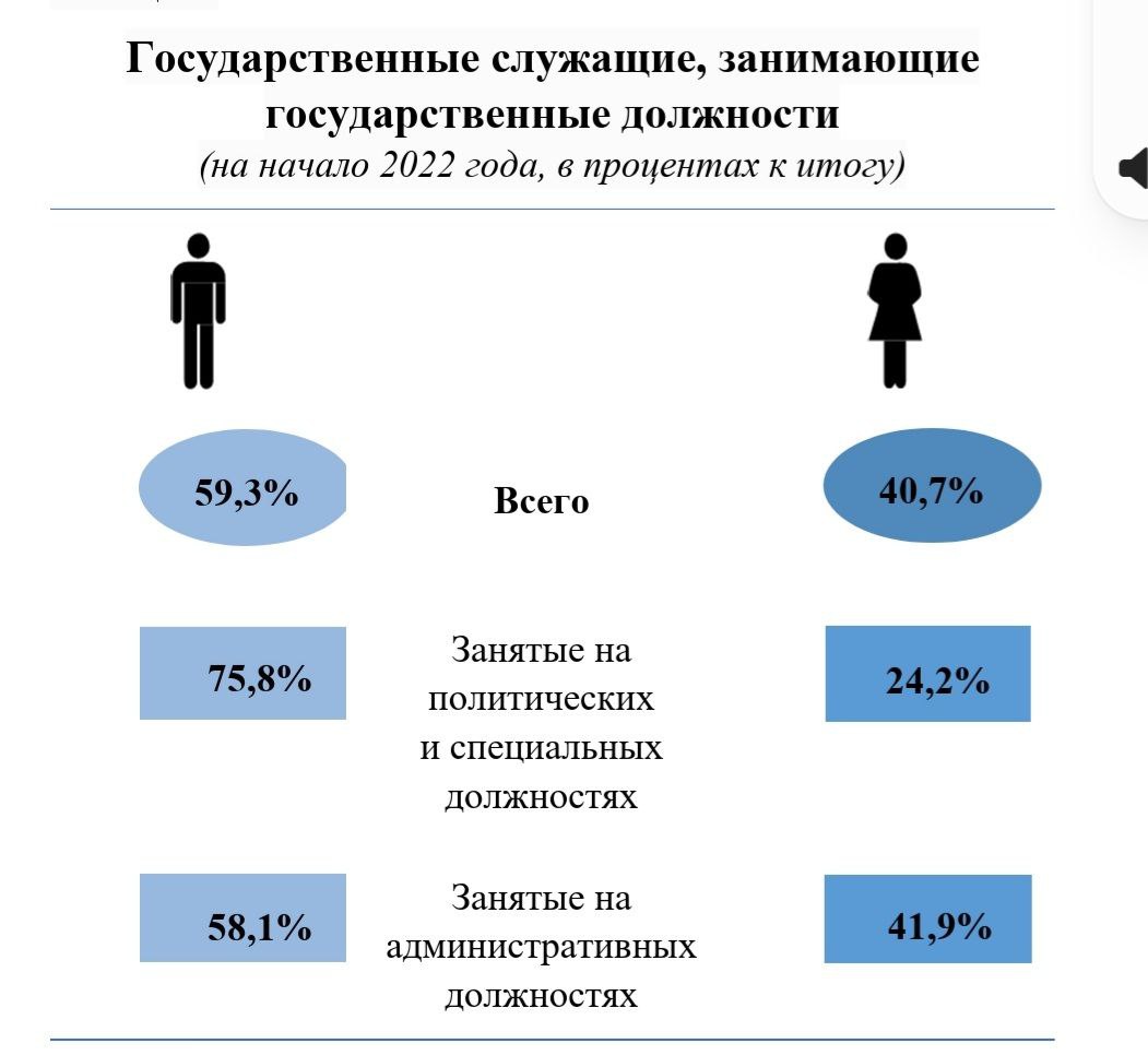 Тем не менее, как и в предыдущие годы, в 2021 году преобладание мужчин, занятых на государственной службе, продолжало сохраняться, как в сфере деятельности органов государственного управления (59%), так и в органах местного самоуправления (62%).