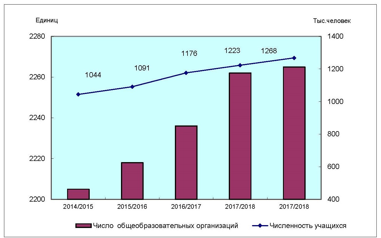 На начало 2018/2019 учебного года в республике действовало 2 265 дневных общеобразовательных организаций. За последние пять лет численность учащихся в них увеличилась на 21 процент и составила 1 млн. 268 тыс. человек, среди которых более 623 тыс. девочек и около 645 тыс. мальчиков.