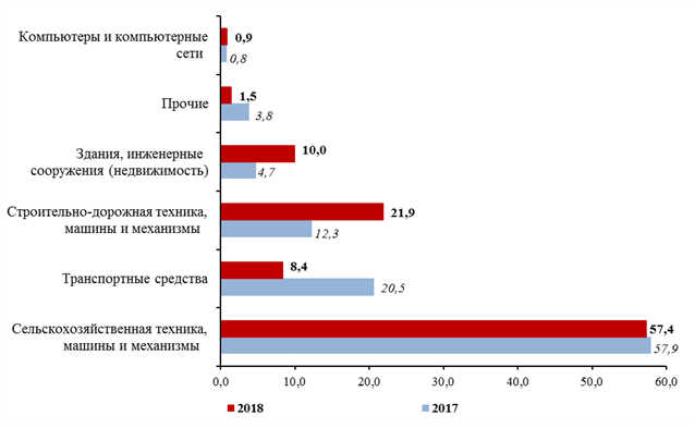 При этом, значительная сумма договоров финансового лизинга, по-прежнему, приходилась на договора, заключенные для приобретения сельскохозяйственной техники, машин и механизмов.