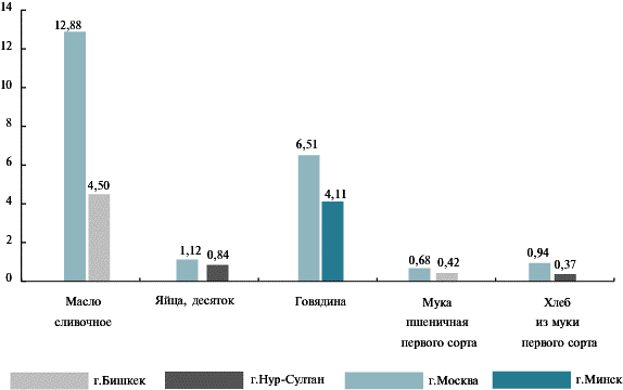 Сопоставимый анализ покупательной способности среднемесячной заработной платы2 по столицам отдельных стран ЕАЭС демонстрирует, что в сентябре 2019 года ее показатели по всем продуктам питания в городе Бишкек отставали от их уровней в других столицах ЕАЭС, что обусловлено низким размером средней заработной платы по городу Бишкек. Например, в Бишкеке на среднюю заработную плату можно купить около 64 килограмма говядины, тогда как в Москве - более чем в 3 раза больше (219 килограмма). В городе Нур-Султан на одну заработную плату можно приобрести более 1,5 тонн муки первого сорта, а в городе Бишкек - 744 килограмма.