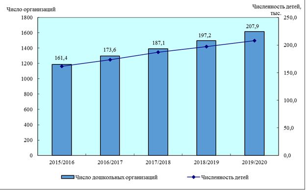 За истекшие пять лет число дошкольных организаций возросло на 36 процентов. На конец 2019 года в республике функционировало 1,6 тыс. дошкольных образовательных организаций, в которых воспитывалось более 25% от общей численности детей соответствующего возраста. В 2019 году в дошкольных образовательных организациях насчитывалось около 208 тыс. детей, число которых по сравнению с 2015 годом увеличилось на 29%.