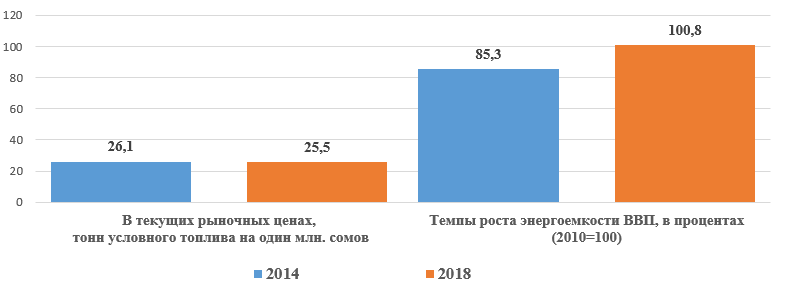 Энергоемкость ВВП определяется как отношение суммарного энергопотребления к величине ВВП. В 2018 году энергоемкость ВВП в текущих рыночных ценах составила 25,5 тонны условного топлива на один млн. сомов и по сравнению с 2014 годом снизилась на 0,6 тонны условного топлива на один млн. сомов. Энергопотребление на душу населения в 2018 году составило 2,4 тонны условного топлива на одну тыс. человек и возросло на 0,5 тонны условного топлива на одну тыс. человек.