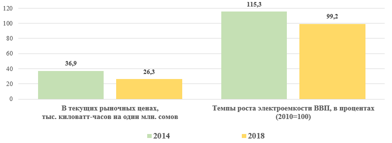 В 2018 году электроемкость ВВП в текущих рыночных ценах составила 26,3 тыс. киловатт - часов на один млн. сомов и по сравнению с 2014 годом снизилась на 10,6 тыс. киловатт - часов на один млн. сомов.