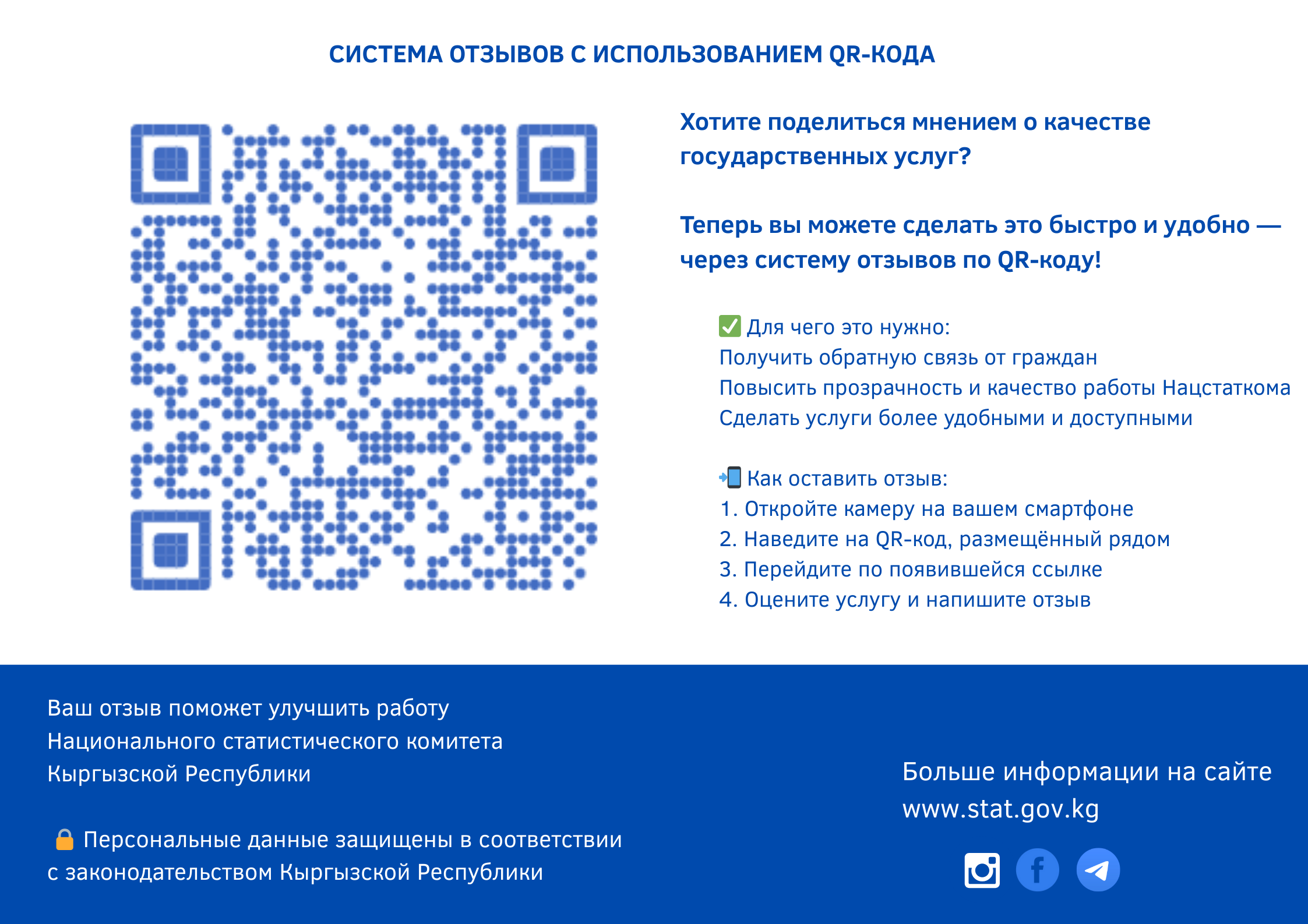 Просто отсканируйте QR-код, размещённый на сайте Нацстаткома, а также поделитесь своим мнением о работе его подведомственных и территориальных органов. Это займёт всего пару минут, но поможет сделать государственные услуги лучше.