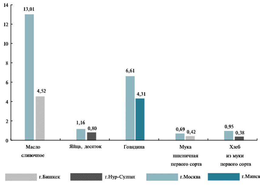 В июне 2019 года максимальная средняя потребительская цена на картофель (0,68 долларов за 1 килограмм) зафиксирована в городе Москва, а минимальная (0,40 долларов США за 1 килограмм) - в городе Нур-Султан. Минимальные средние потребительские цены на баранину (4,34 долларов США за 1 килограмм) в июне 2019 года зарегистрированы в городе Бишкек, молоко пастеризованное (0,67 долларов США за 1 литр) - в городе Нур-Султан.