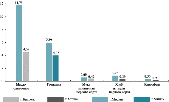 Сравнительный анализ покупательной способности среднемесячной заработной платы2 по столицам отдельных государств-членов ЕАЭС показывает, что в октябре 2018 года ее показатели по всем продуктам питания в г. Бишкек отстают от их уровней в остальных столицах, что обусловлено низким размером средней заработной платы по г. Бишкек.