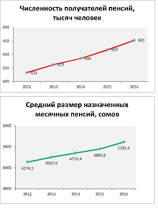 Средний размер назначенных месячных пенсий в 2016г. составил 5235,4 сома, что в 1,2 раза превысило бюджет прожиточного минимума для пенсионеров.
