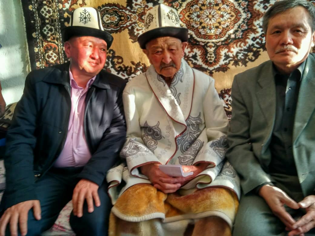 (Фото сделано 18 марта 2020 года. В центре ветеран ВОВ Сабыр Жайылканов, справа - заведующий отделом методического обеспечения Нацстаткома Бекен Кенжебаев и слева - руководитель Иссык-Кульского областного управления государственной статистики Улан Искатов).