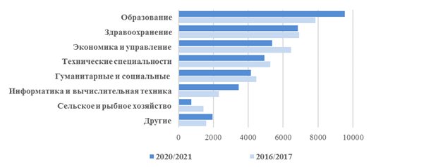 По сравнению с 2016/2017 учебным годом наибольший рост численности поступающих отмечался на специальности информатика и вычислительная техника (на 49 %) и образование (на 21%), в то время как численность поступающих на специальности сельское и рыбное хозяйство сократилась в 2 раза, экономика и управление - почти на 17%.