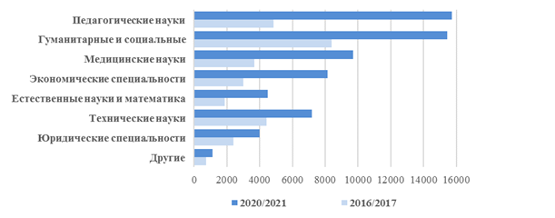 По сравнению с 2016/2017 годом значительно возросло число поступающих по специальности педагогические науки (в 3,3 раза), экономические специальности (в 2,7 раза), медицинские специальности (в 2,6 раза), а также гуманитарные и социальные специальности (в 1,8 раза).
